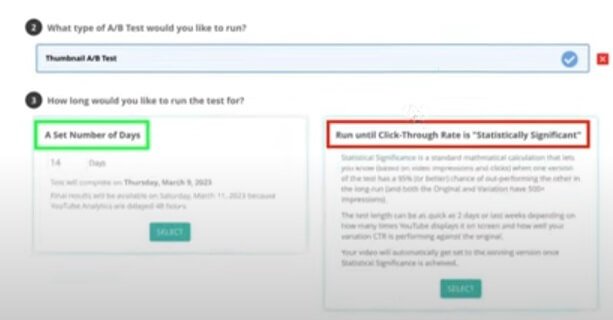 Now you can choose to run the Split test for a certain amount of days, or you run it until TubeBuddy is sure that one of the thumbnail is performing better. Never choose that option! Why? It only looks at the Click-through rate. But it is also very important to take a look at the Average View duration. If that drops drastically with a better performing Click-through rate in the eyes of TubeBuddy. It can harm the exposure of your video and give you fewer views, So always choose the Number of days. I always keep it at 14 days within 14 days you will know which thumbnail is performing better.